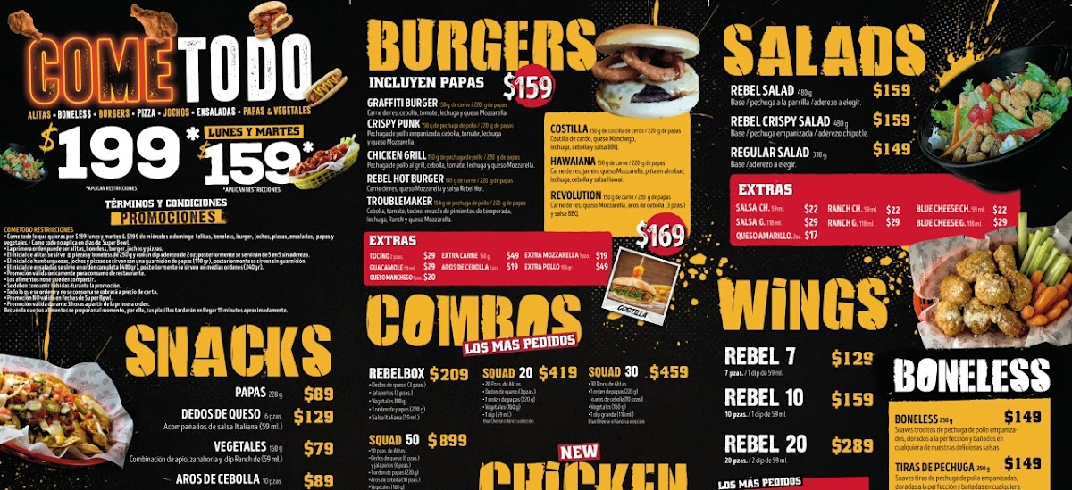 For inquiries or reservations, feel free to reach out at +52 712 163 2700. Discover a new favorite at Rebel Wings, where every meal is a small rebellion against the ordinary.